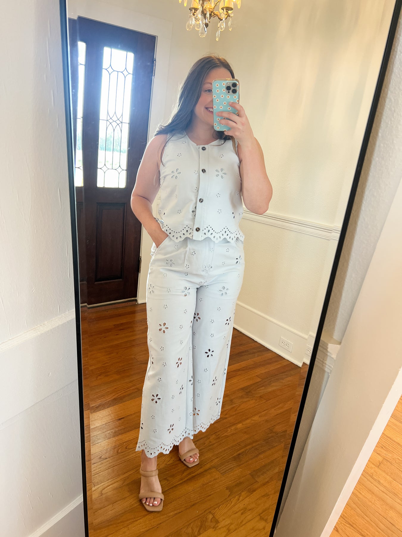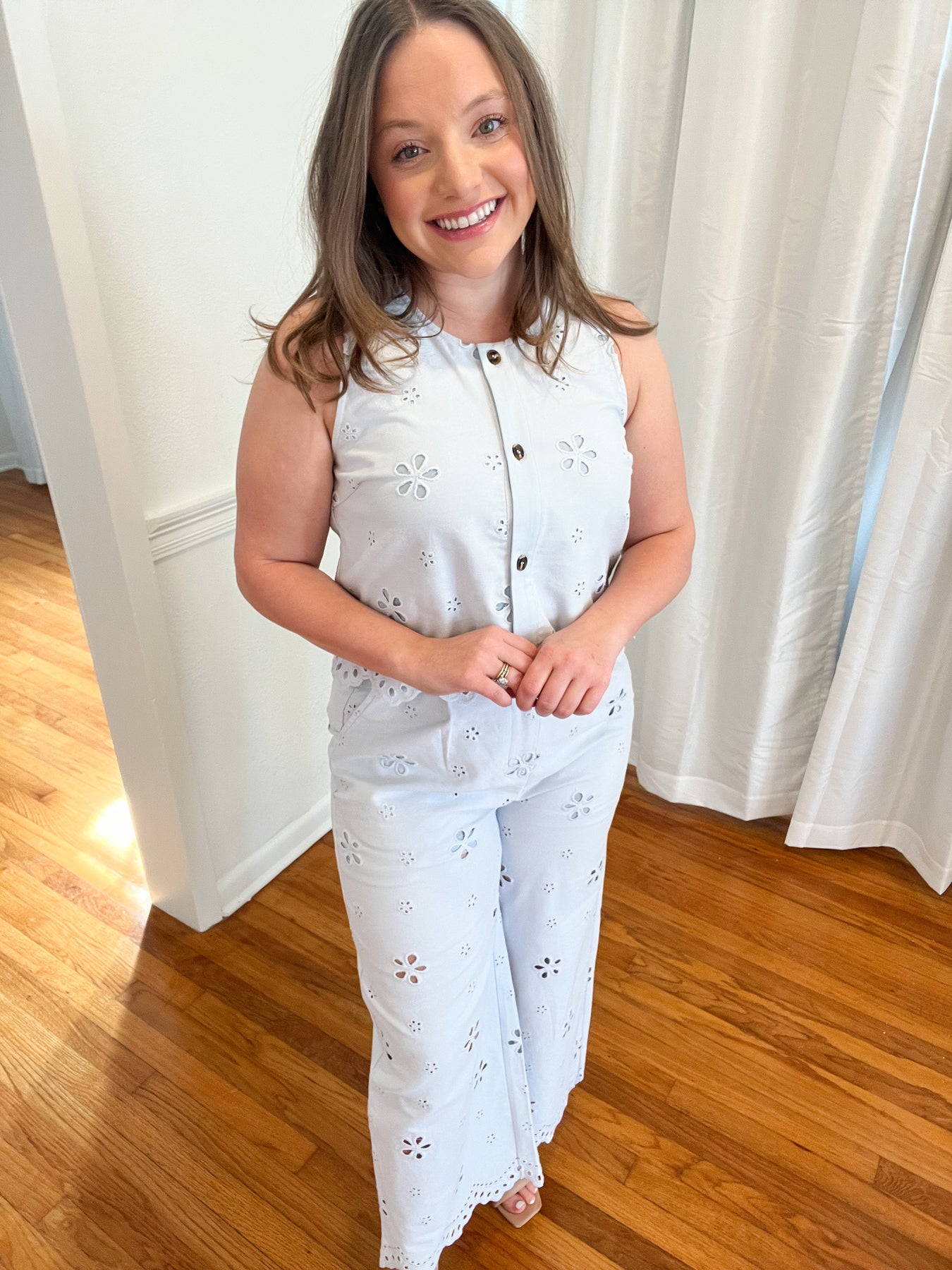 Soft, feminine, and effortlessly chic, the Baby Blue Eyelet Button-Front Tank is a timeless warm-weather staple. Designed with delicate eyelet detailing throughout, this sleeveless top features a classic button-front closure and a softly scalloped hem for a flattering, polished finish. Lightweight and breathable, it’s easy to dress up or down and pairs seamlessly with denim, skirts, or coordinating eyelet bottoms for a fresh, pulled-together look.