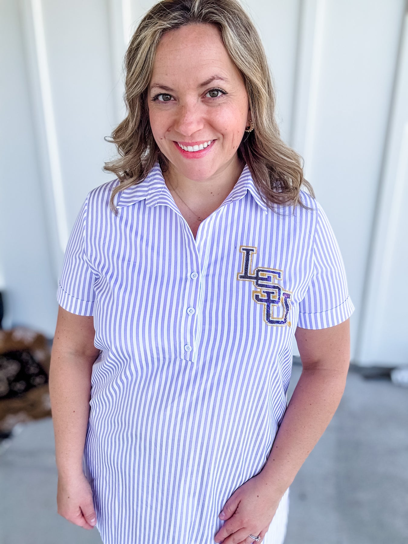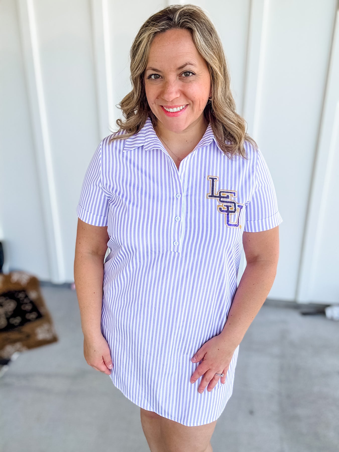 Say hello to the game day dress you’ll reach for again and again! Our LSU Logo Dress features a classic lilac pinstripe with officially licensed LSU logo detailing—designed in-house and trademark approved for the perfect touch of Tiger spirit.