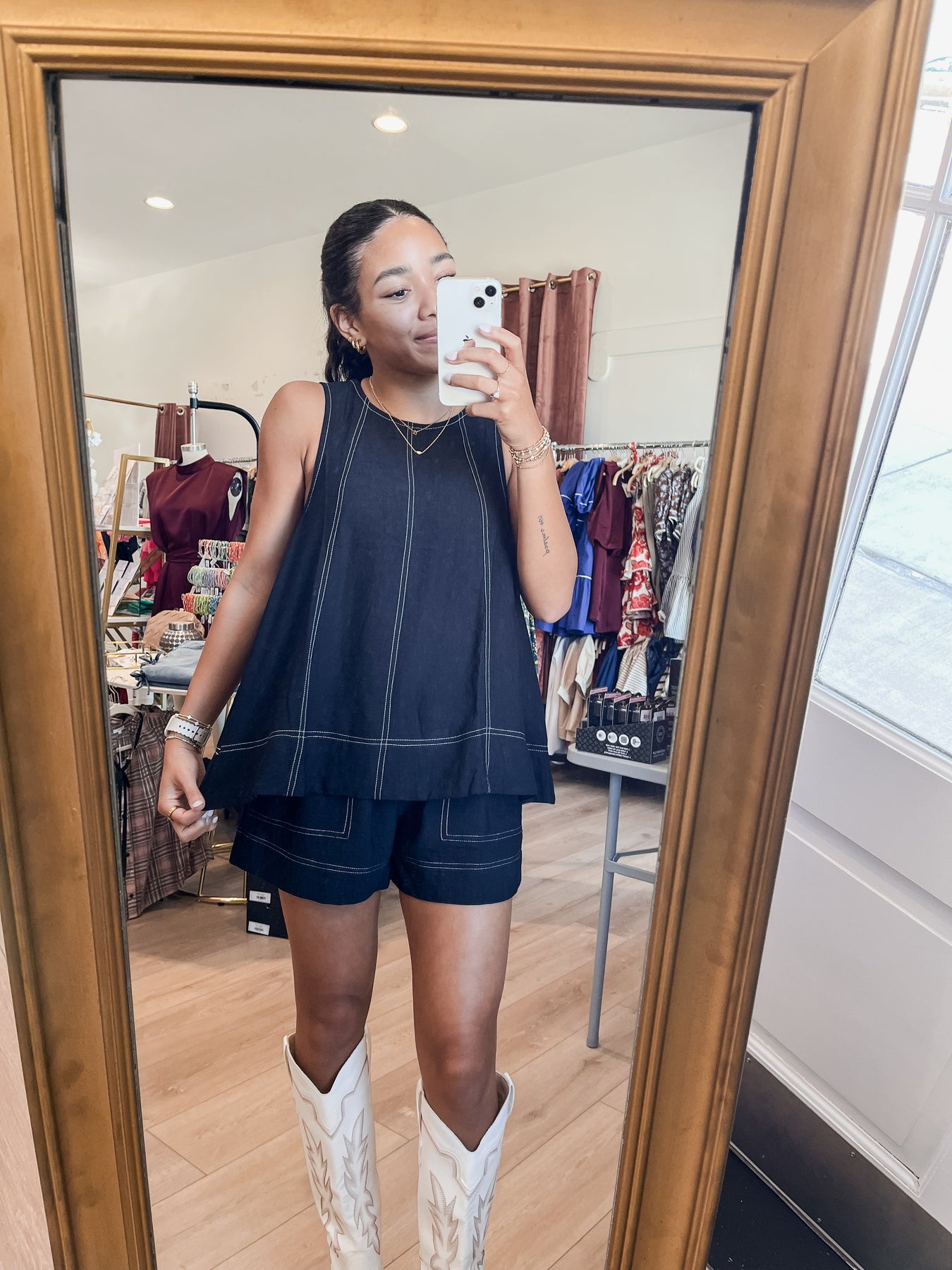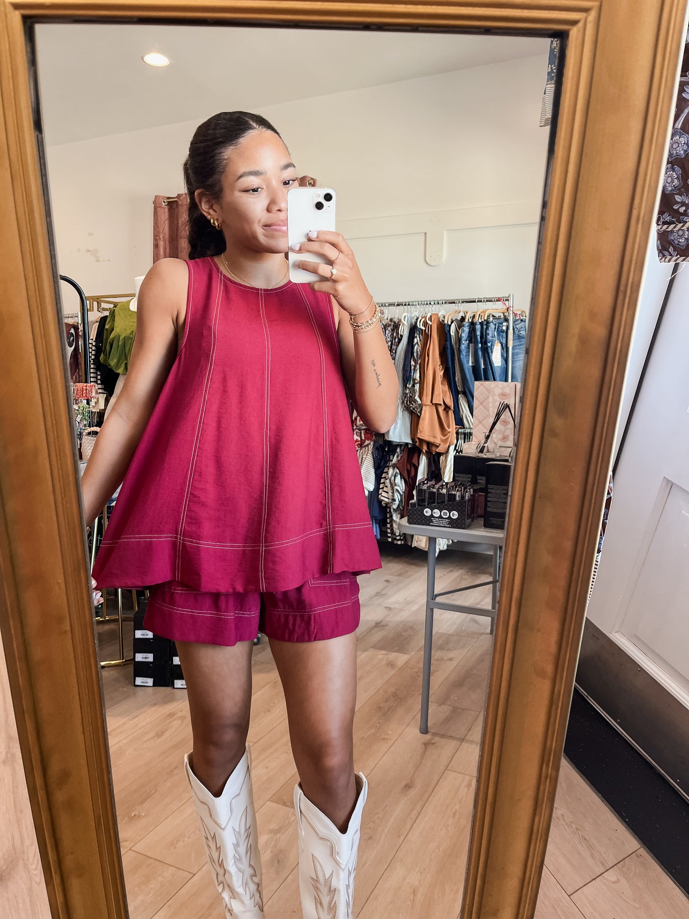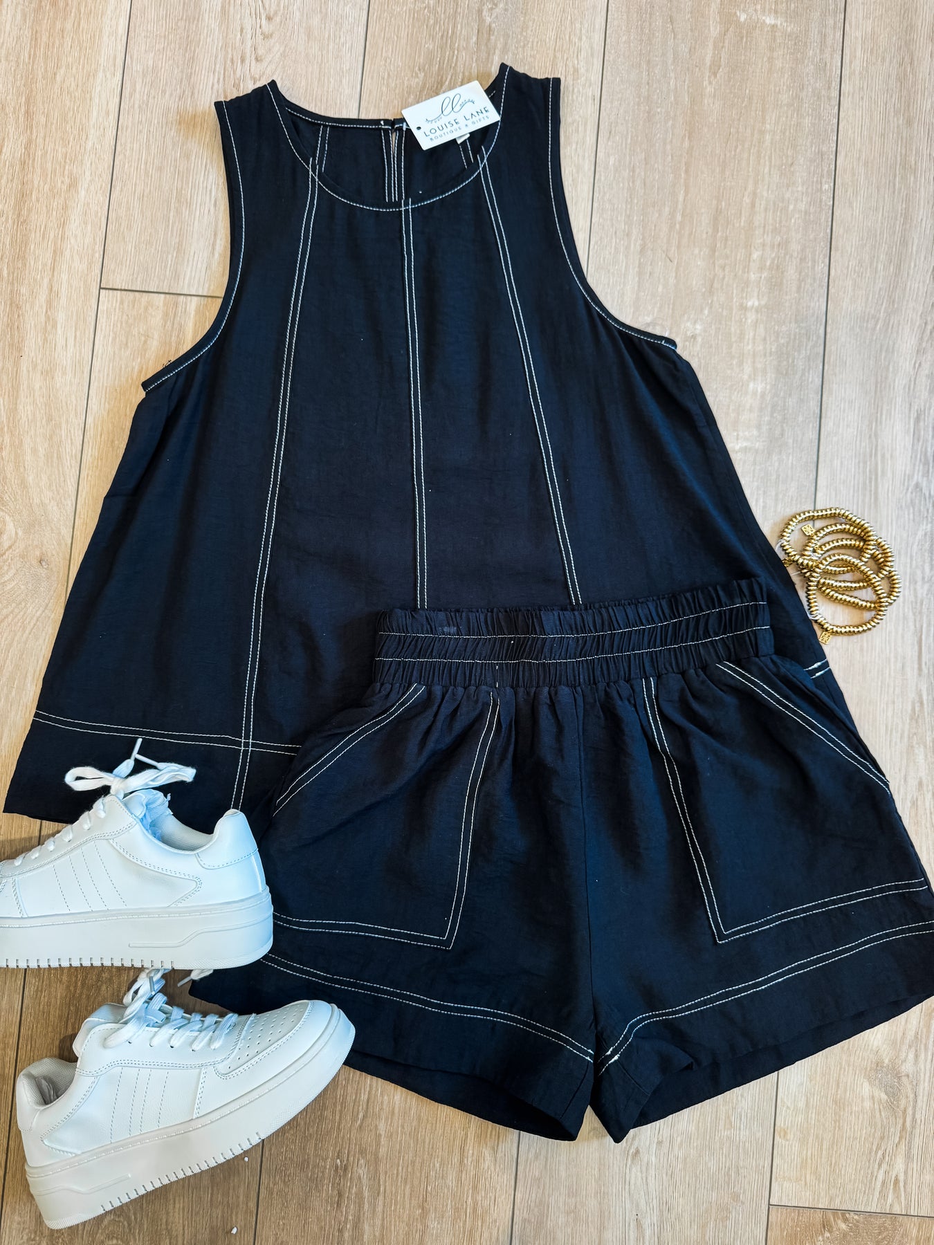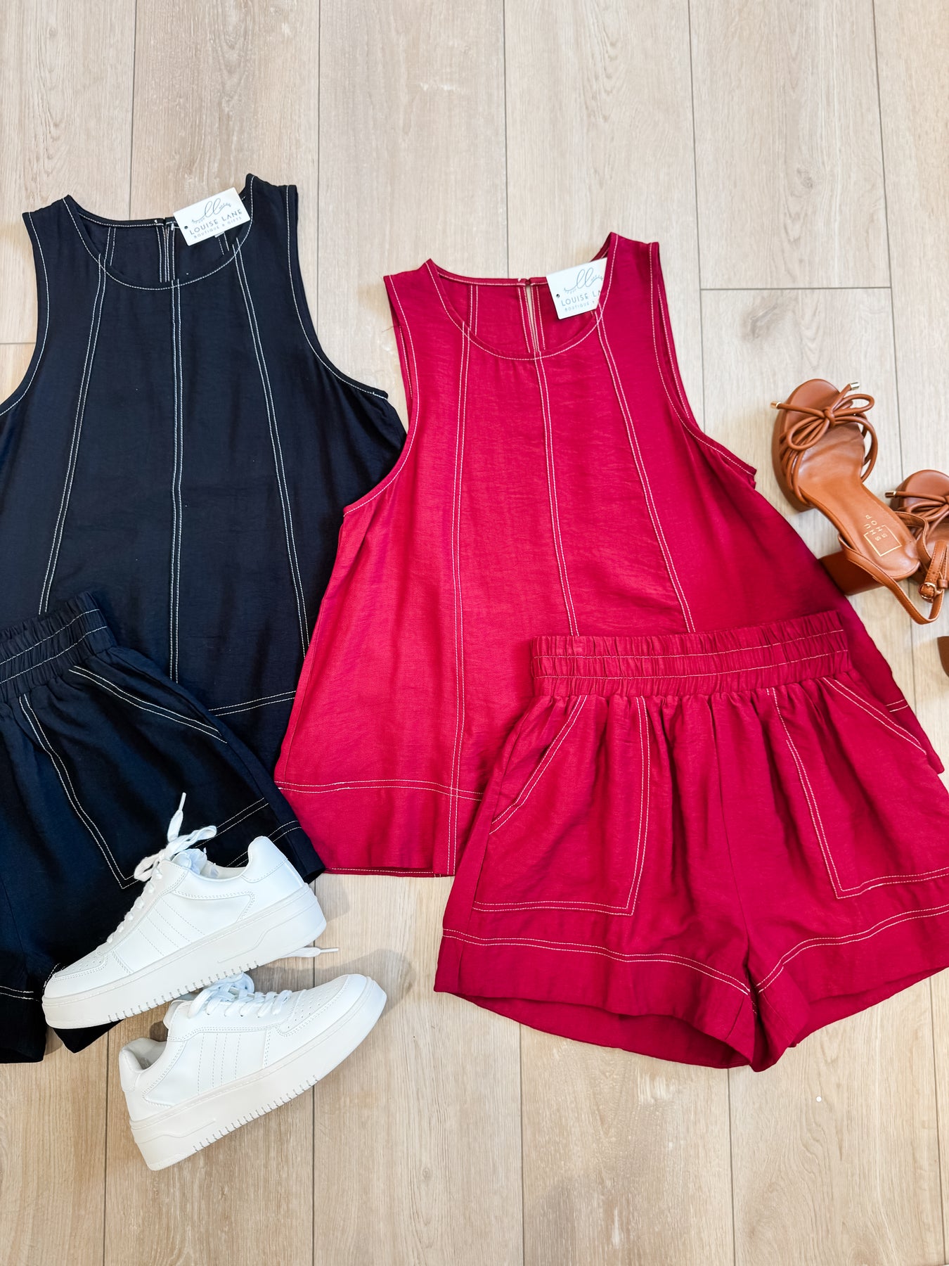 The Maisy Set pairs a solid sleeveless pullover top with high-waisted shorts featuring a comfy elastic waistband. Perfect for sunny days, this playful duo offers effortless style and all-day comfort, making it your go-to outfit for casual adventures and laid-back fun.