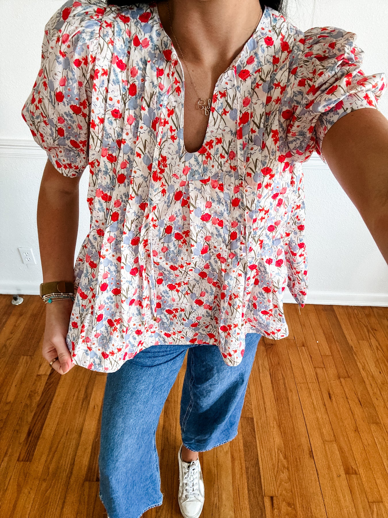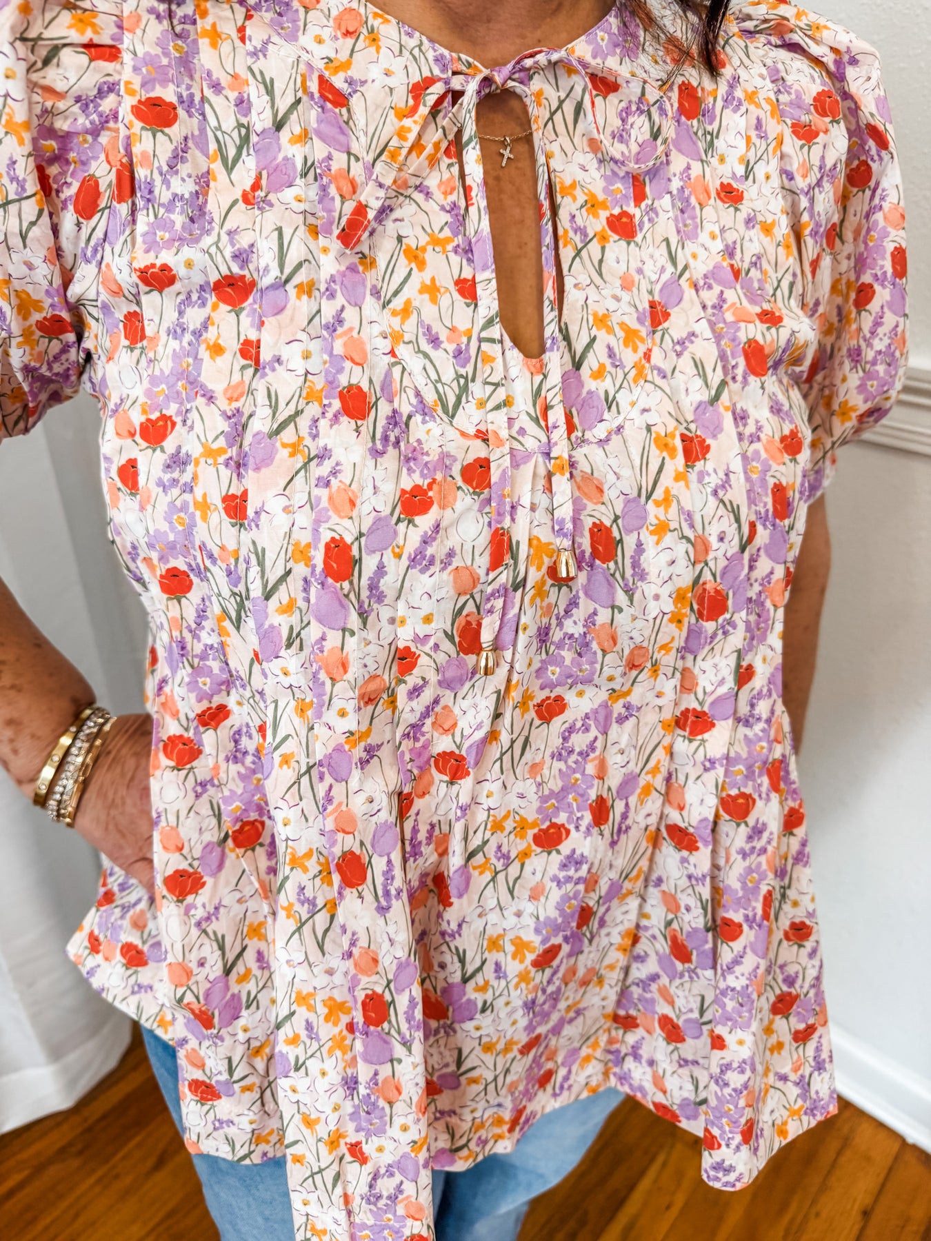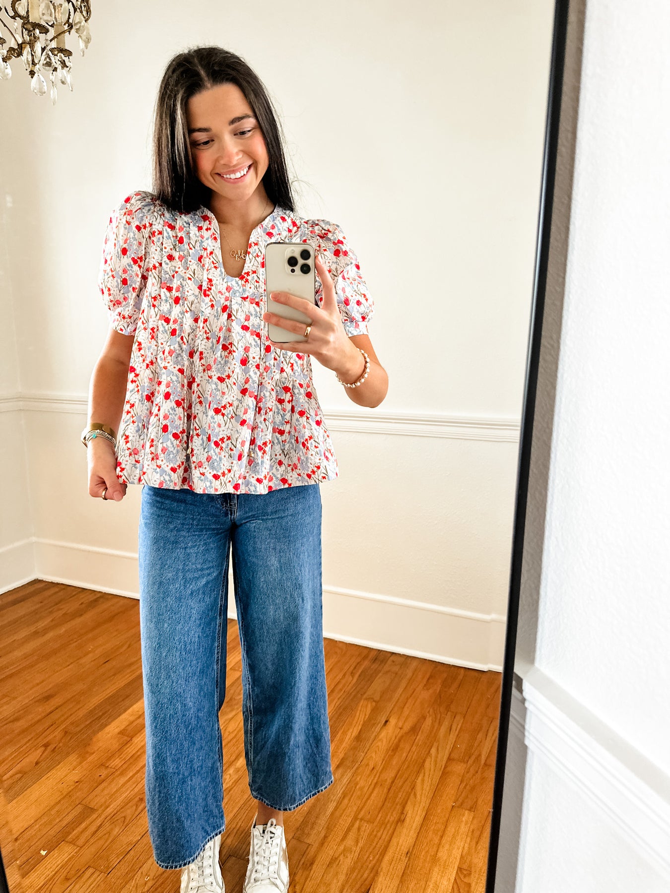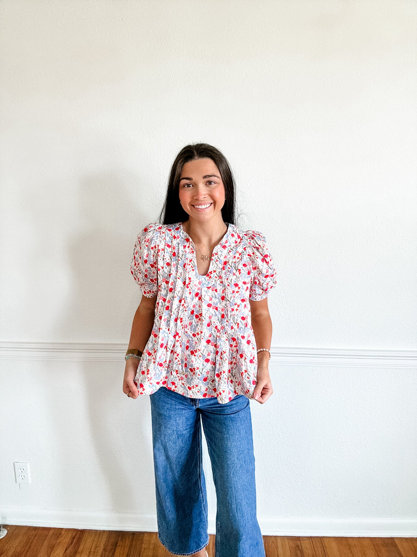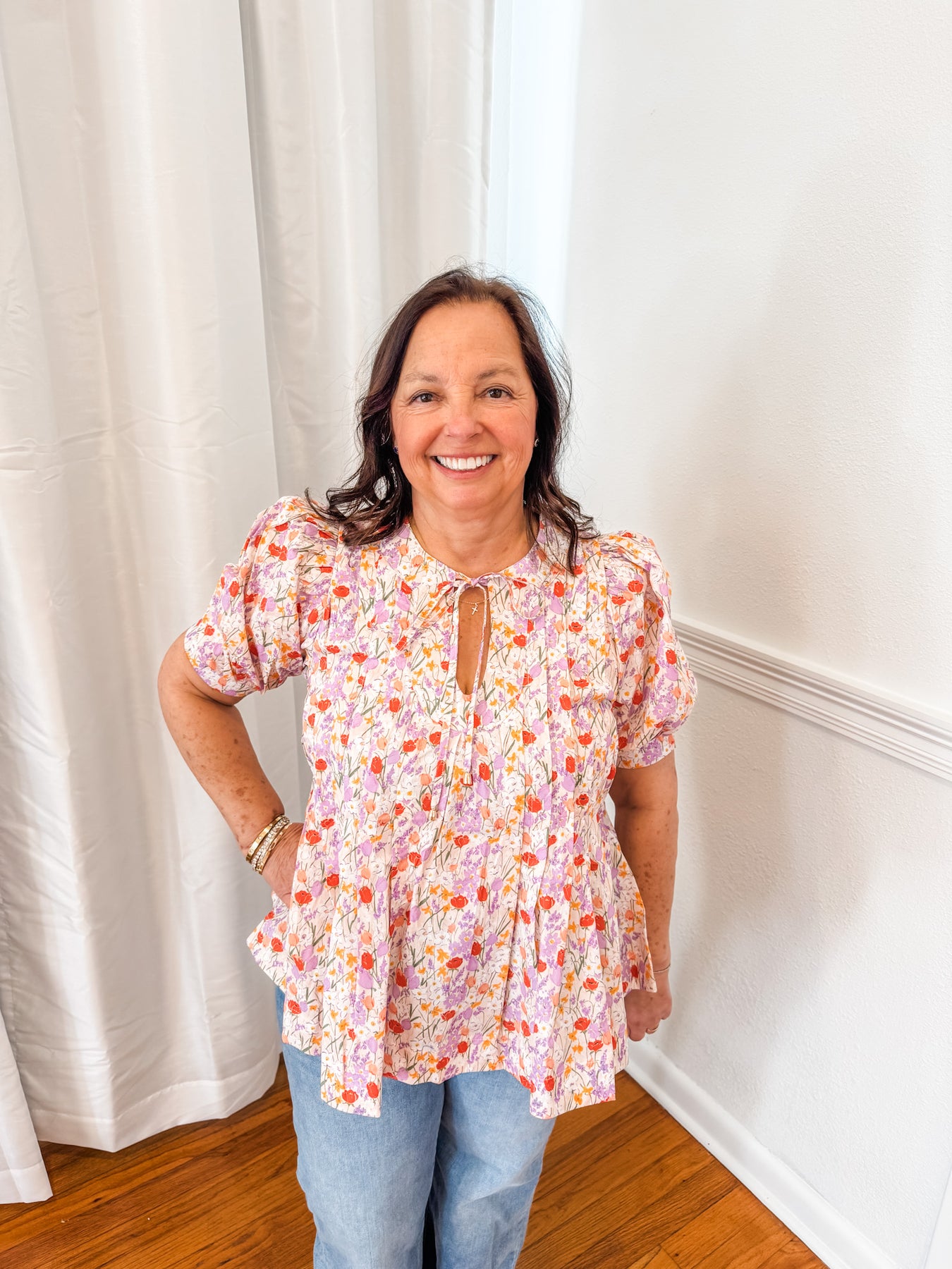 Soft, romantic, and timeless — the Countryside Charm Blouse is the perfect blend of everyday ease and feminine detail. Designed with a delicate floral print throughout, this blouse features gentle pleating through the bodice, subtle puff sleeves, and a flattering split neckline that adds just the right touch of charm.