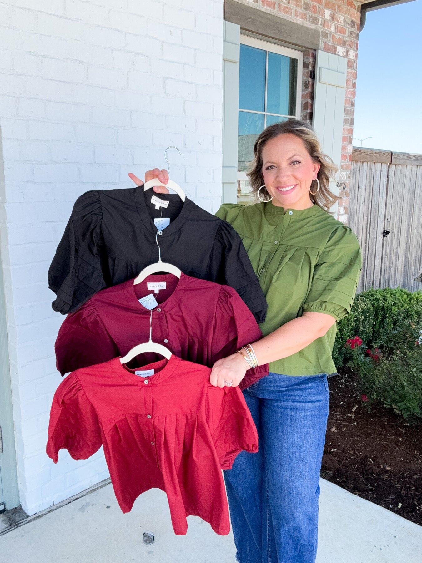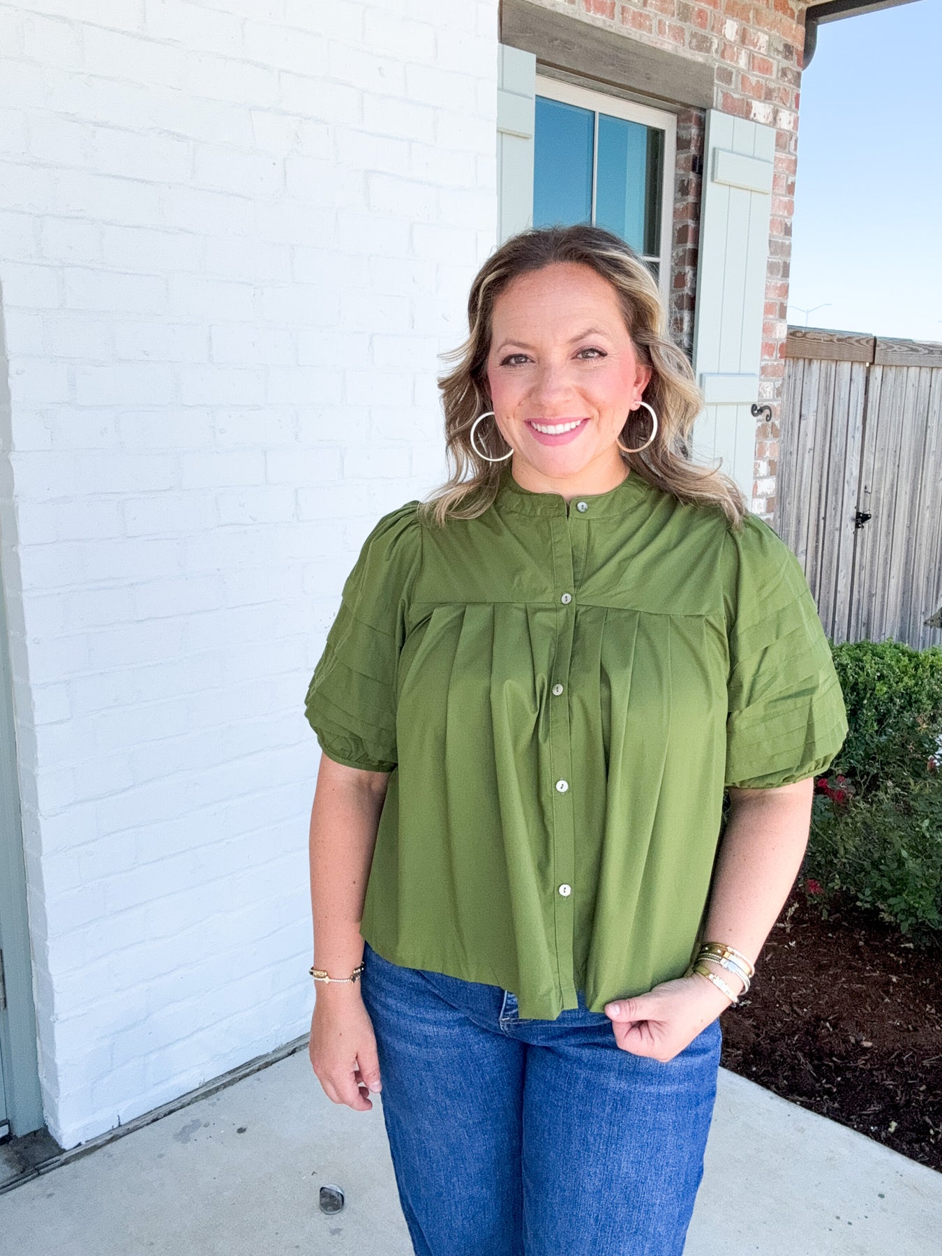 Bring a playful touch to your wardrobe with The Grace Blouse, featuring charming pintuck details and short puff sleeves that add fun volume. Its pleated front and button closure create a flirty, polished look perfect for day or night. Available in bold black, burgundy, olive and vibrant red to match your mood.