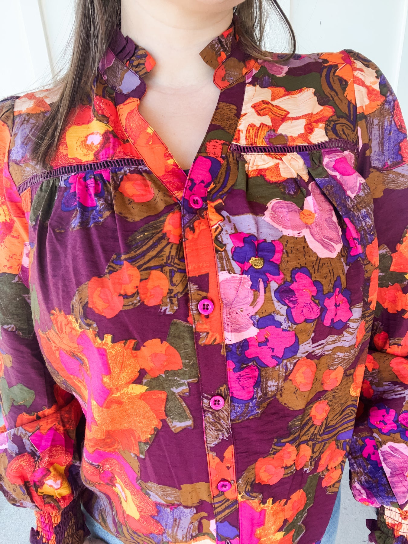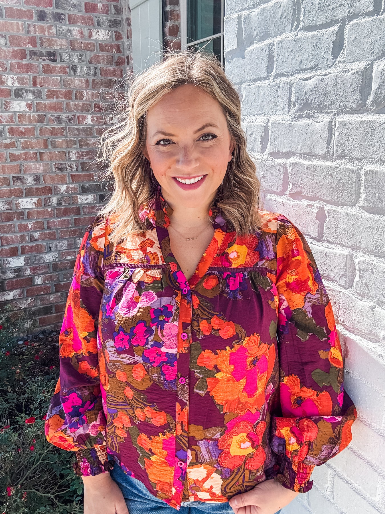 Bring color and confidence into your wardrobe with our Autumn Bloom Blouse! 🍂✨ Featuring a stunning mix of magenta, orange, and plum florals on a rich, silky fabric — this blouse is the perfect statement for the season. The ruffled neckline, button front, and smocked cuffs add feminine charm, while the relaxed fit keeps it effortlessly chic and comfortable.