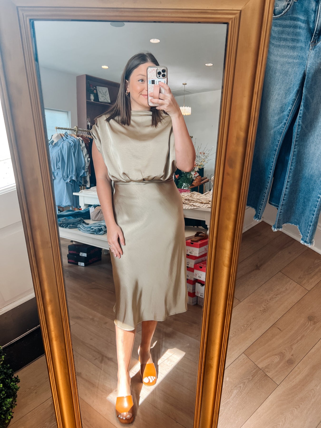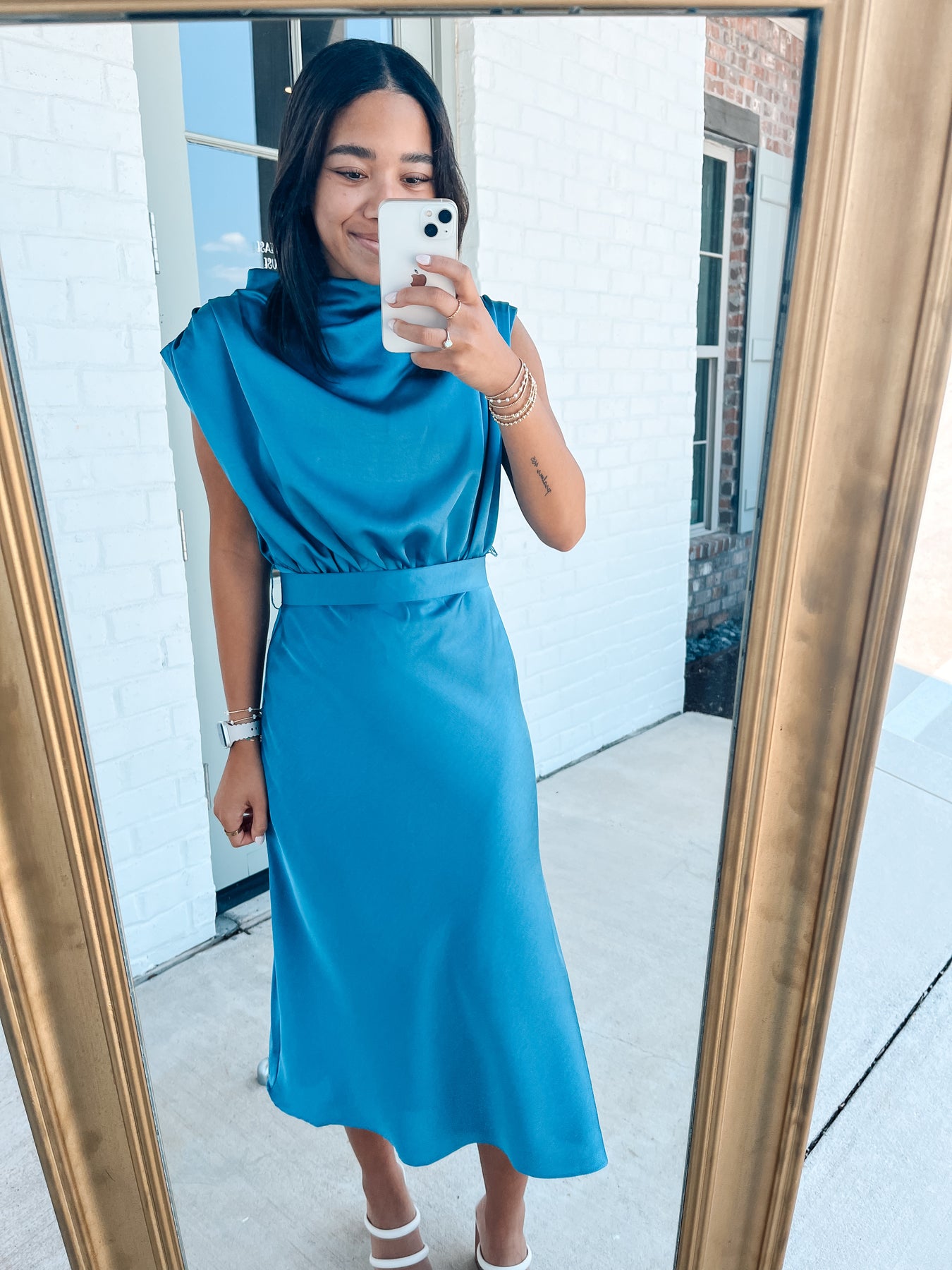 Step into effortless charm with the Easy Does It Midi Dress. This blue mock neck sleeveless dress blends comfort and style, making it your go-to for sunny days or layered looks. Its flattering midi length moves with you, perfect for playful adventures or casual chic moments. Dress it up or down—easy does it!