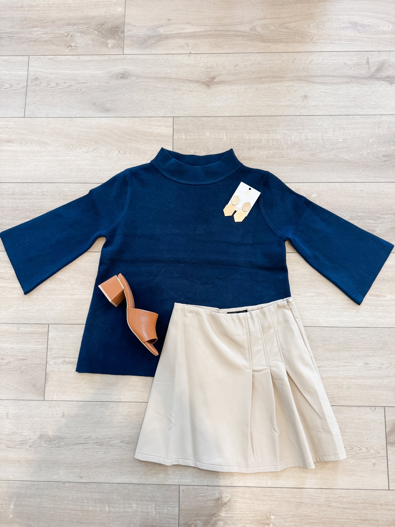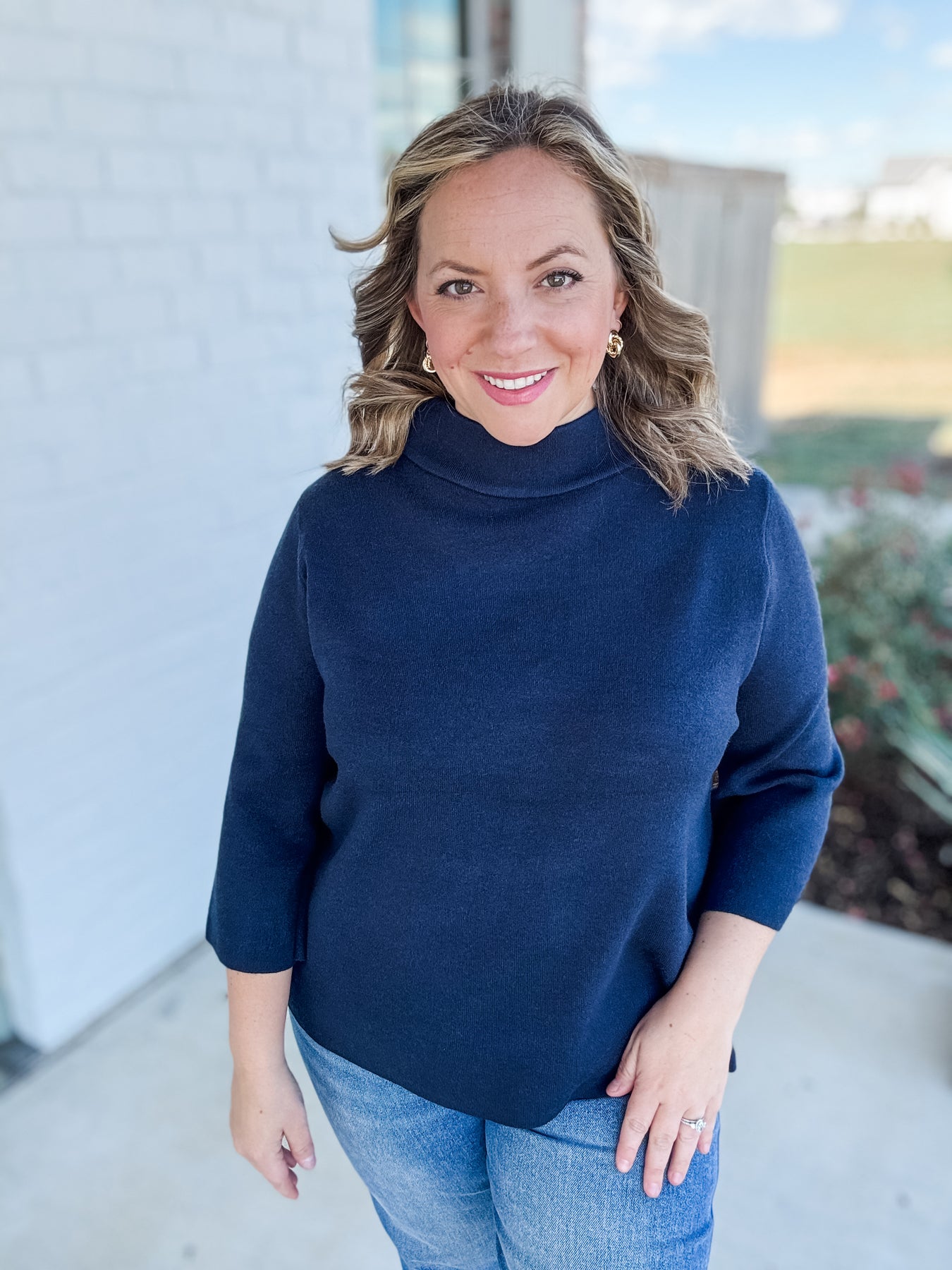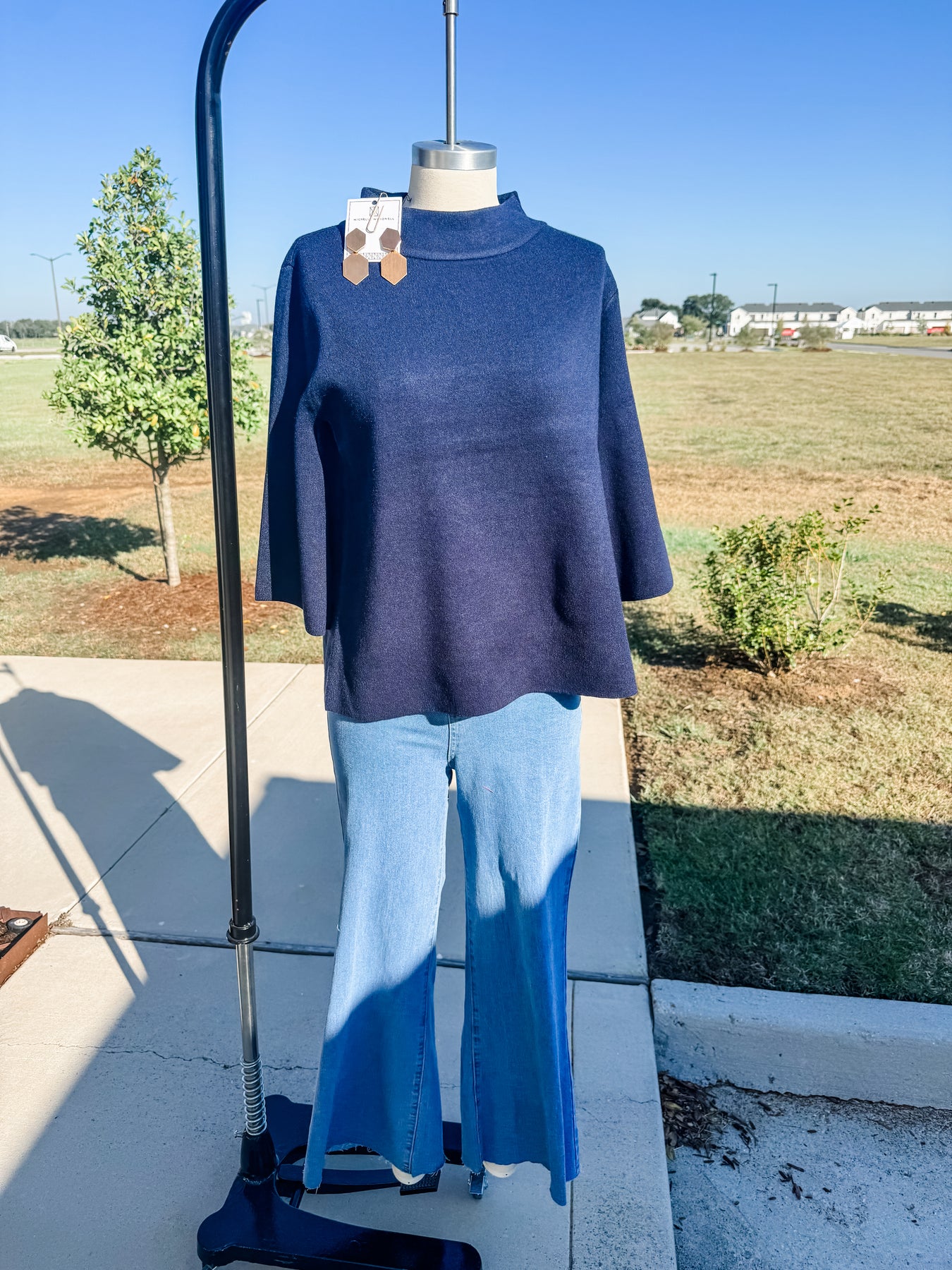 Meet your new go-to for chic comfort — The Emerson Pullover. Crafted in a deep navy hue with a soft, medium-weight knit, this top blends simplicity and sophistication for effortless everyday style. The mock neckline and subtle bell sleeves add a touch of elegance, making it perfect for dressing up or down through every season.