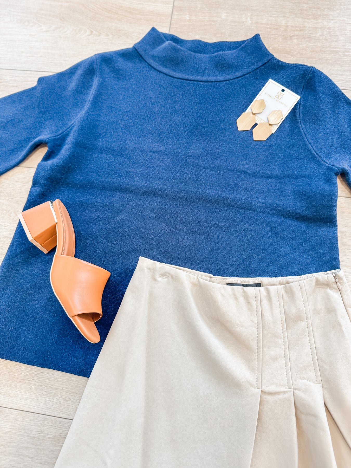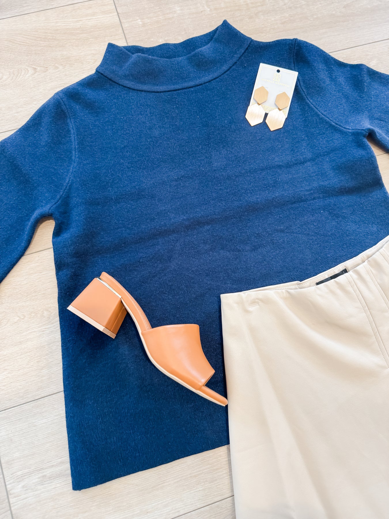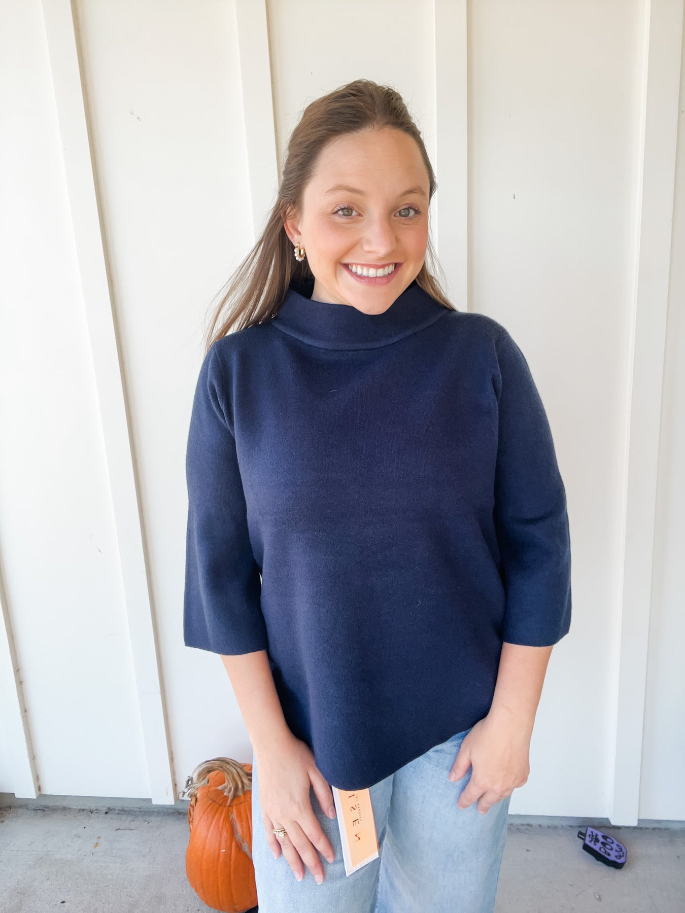 Meet your new go-to for chic comfort — The Emerson Pullover. Crafted in a deep navy hue with a soft, medium-weight knit, this top blends simplicity and sophistication for effortless everyday style. The mock neckline and subtle bell sleeves add a touch of elegance, making it perfect for dressing up or down through every season.