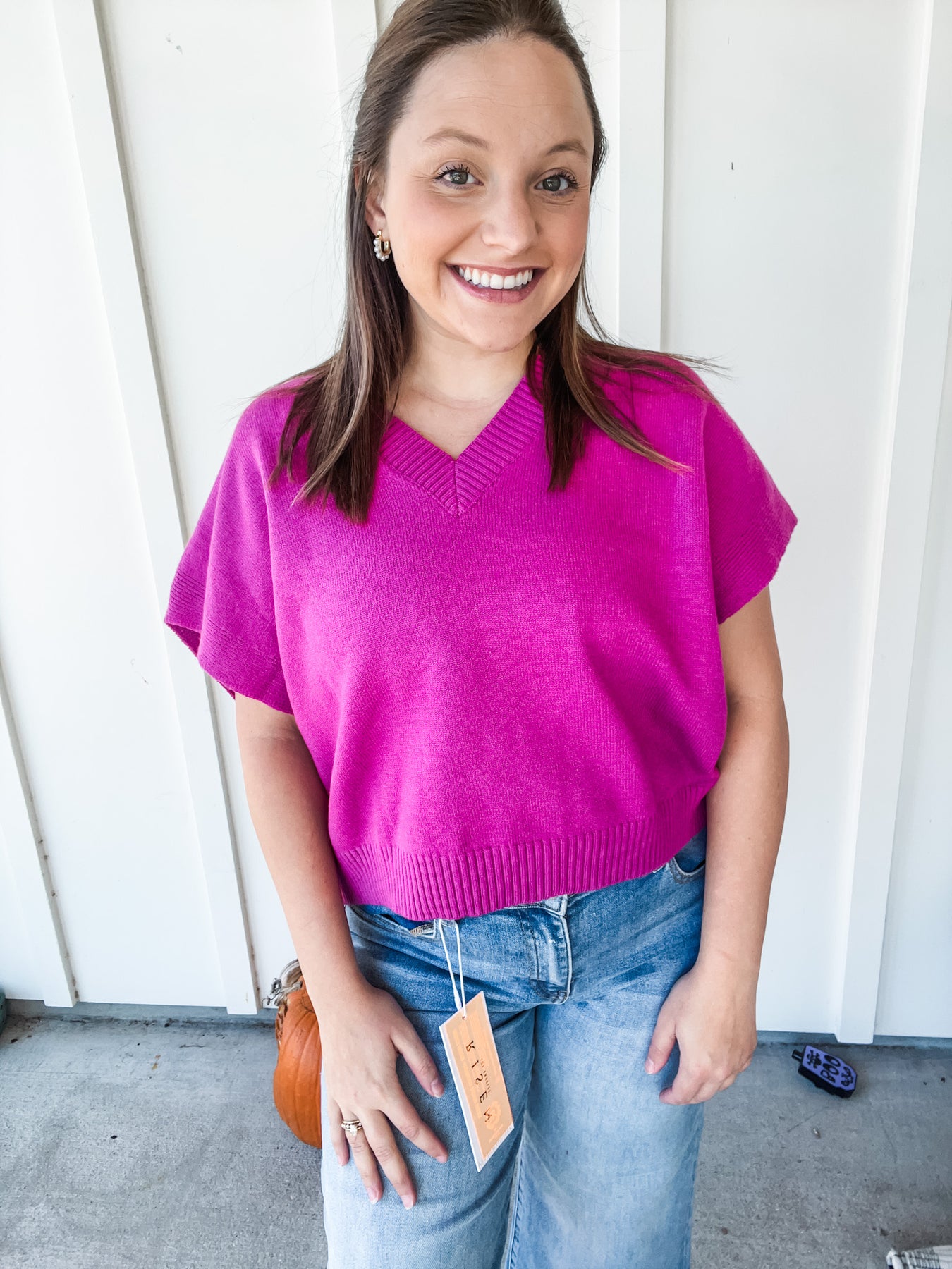 Bright, bold, and effortlessly chic — The Harper Knit Vest brings a pop of vibrant fuchsia magenta to your cool-weather wardrobe. This eye-catching knit features a flattering V-neckline, relaxed silhouette, and ribbed trim for a polished finish. Perfect for layering over a collared blouse or turtleneck on cooler gamedays or styling solo for a modern, laid-back look.