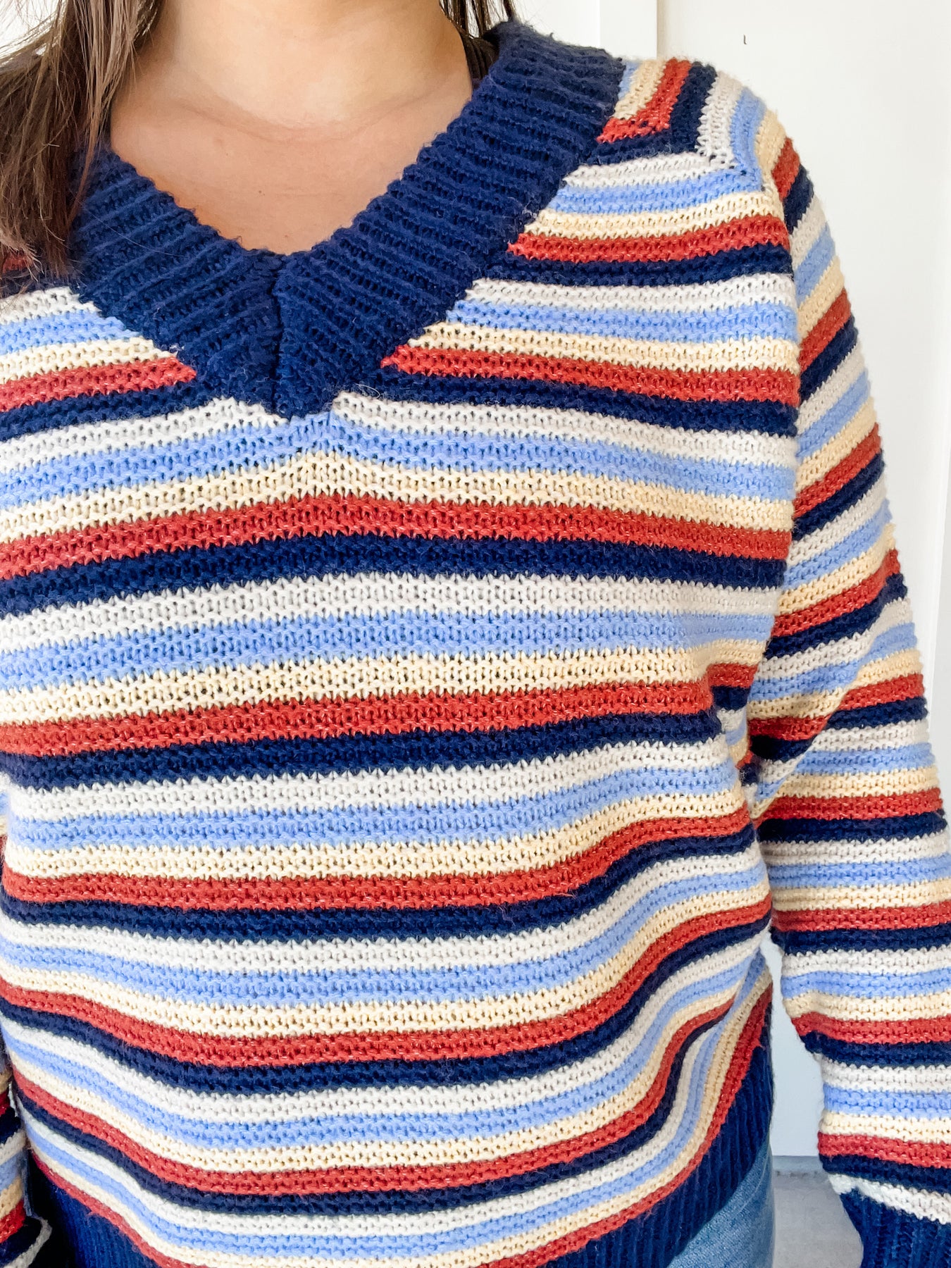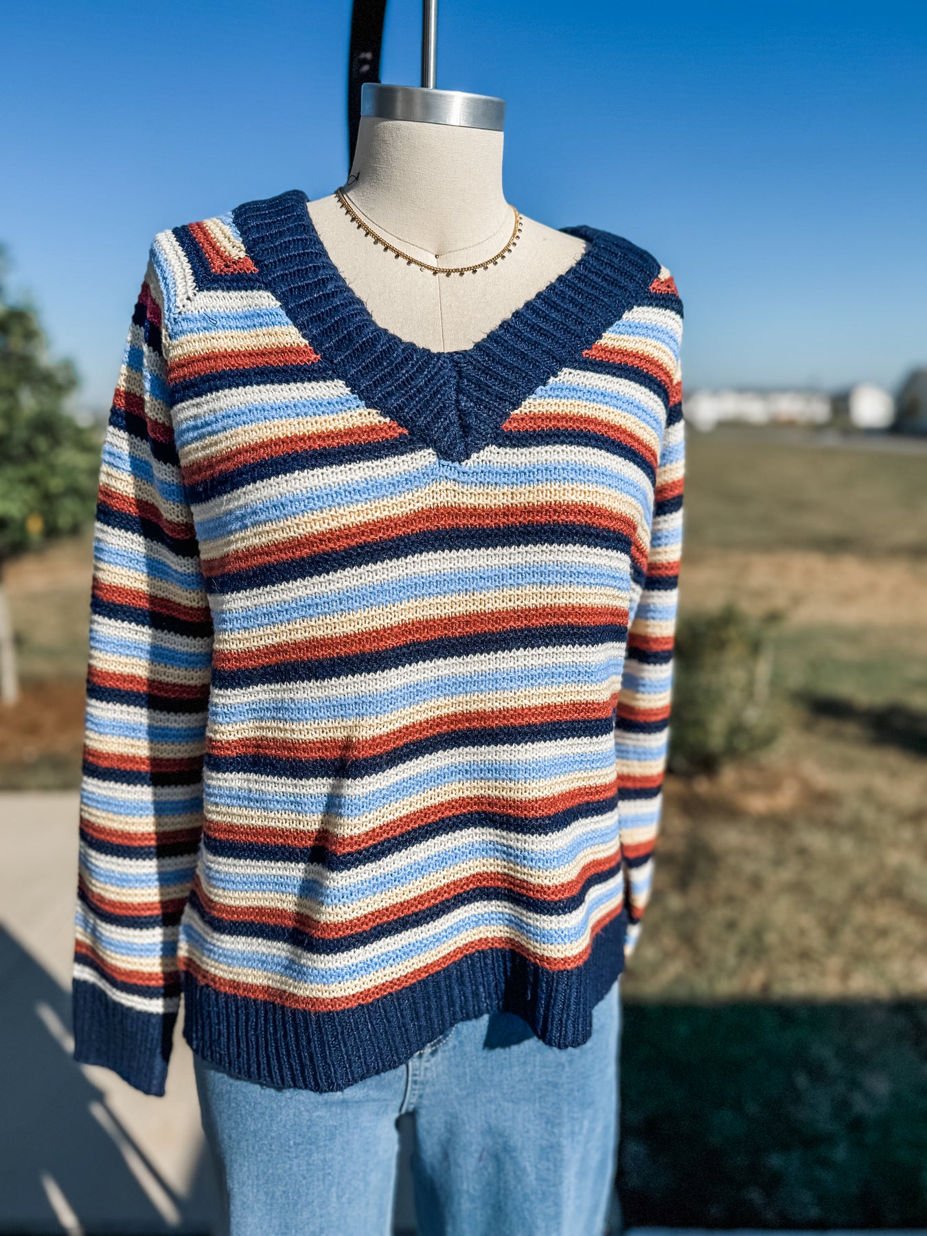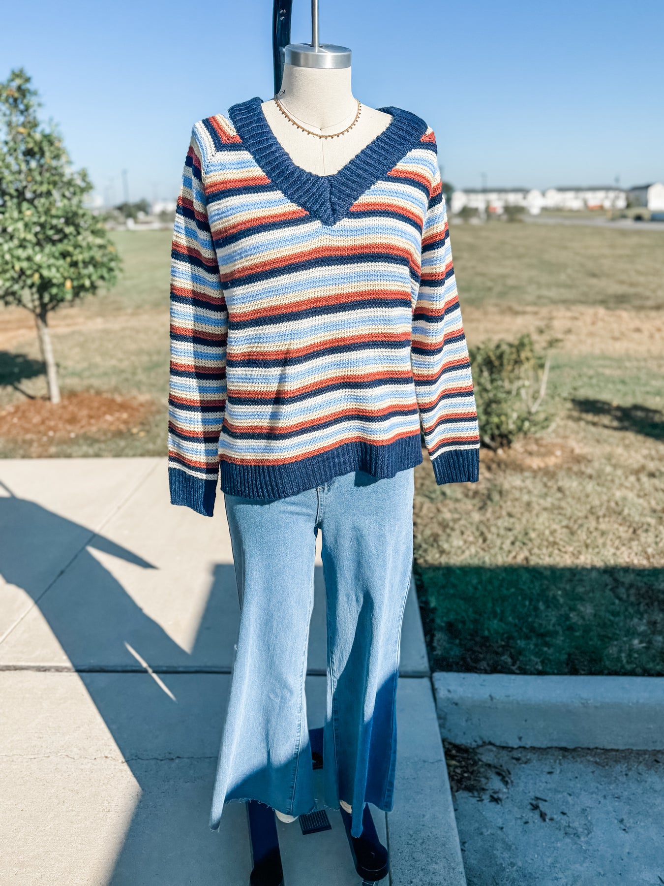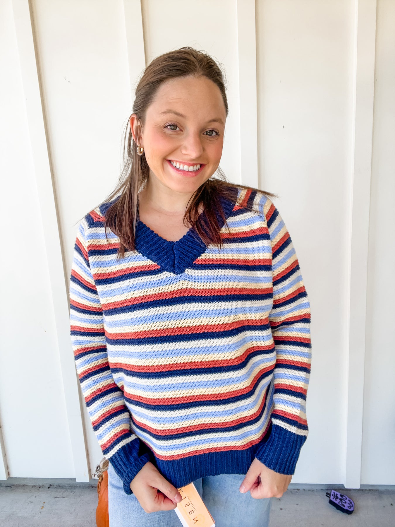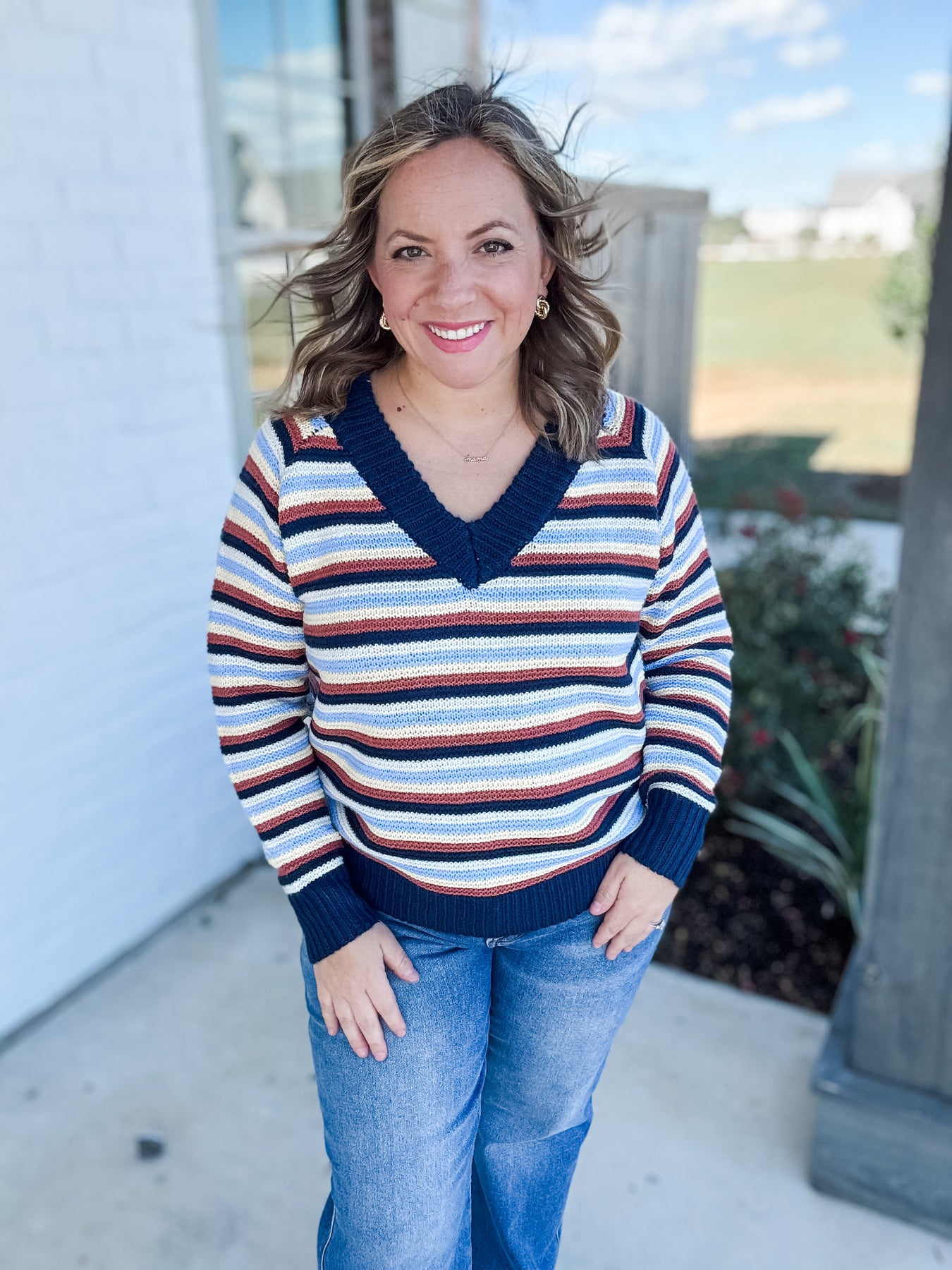 Add a pop of color to your cool-weather wardrobe with The Harper Striped Sweater. Featuring a flattering V-neckline, relaxed fit, and cozy knit texture, this sweater combines comfort and style with ease. The mix of navy, rust, cream, and sky blue stripes makes it a cheerful choice for transitioning through the seasons.
