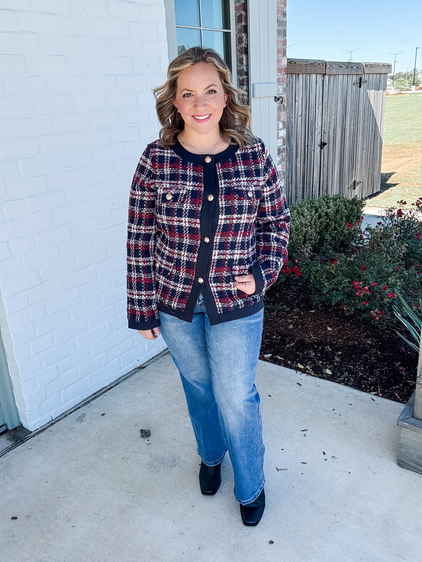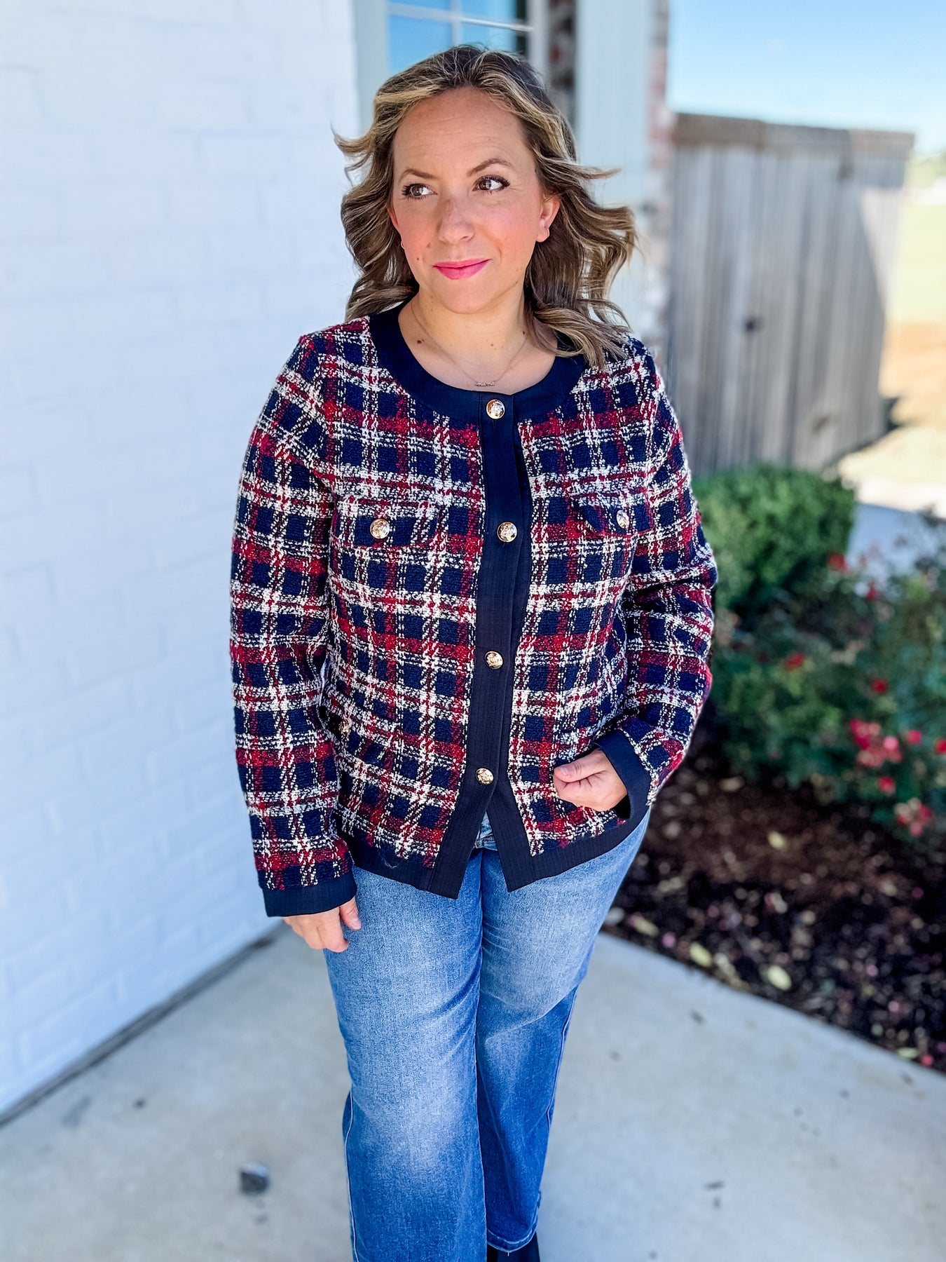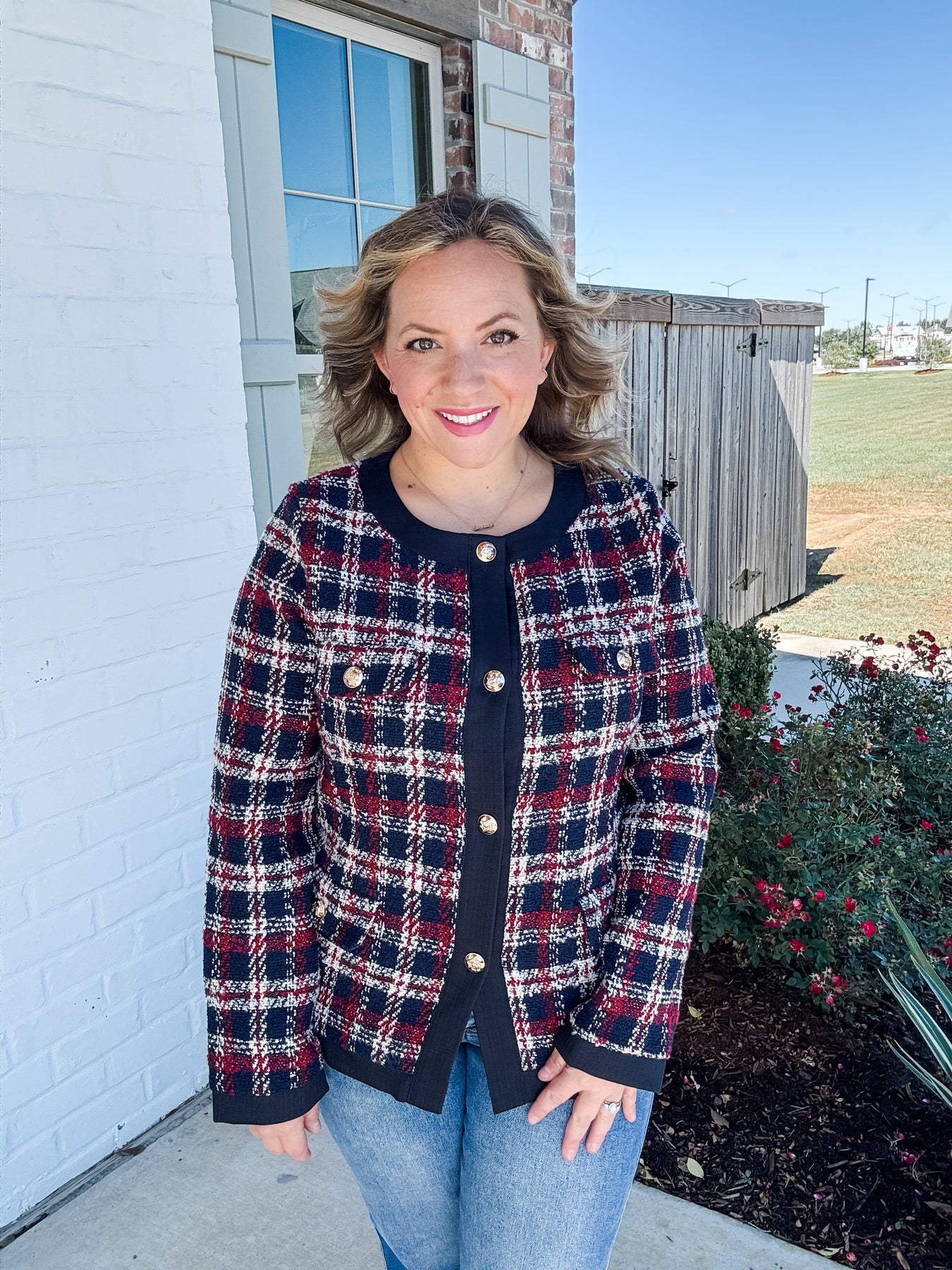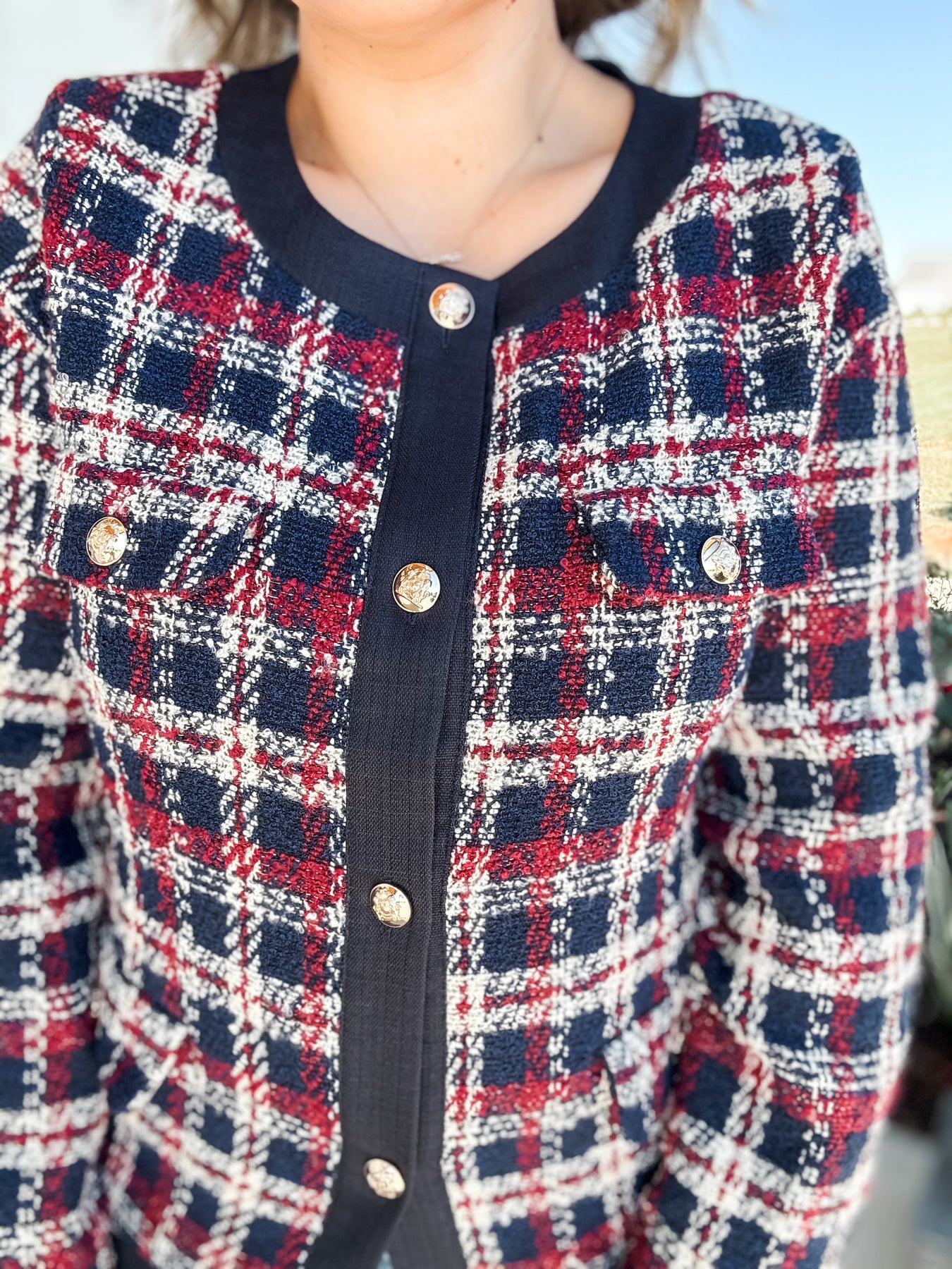 Classic elegance with a modern twist — The Kensington Tweed Jacket is a timeless statement piece for your wardrobe. Designed in rich shades of navy, wine, and cream plaid, this jacket features a structured silhouette, gold embossed buttons, and contrasting black trim that exudes sophistication.