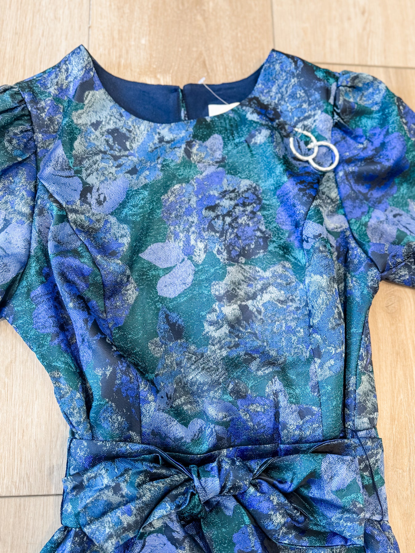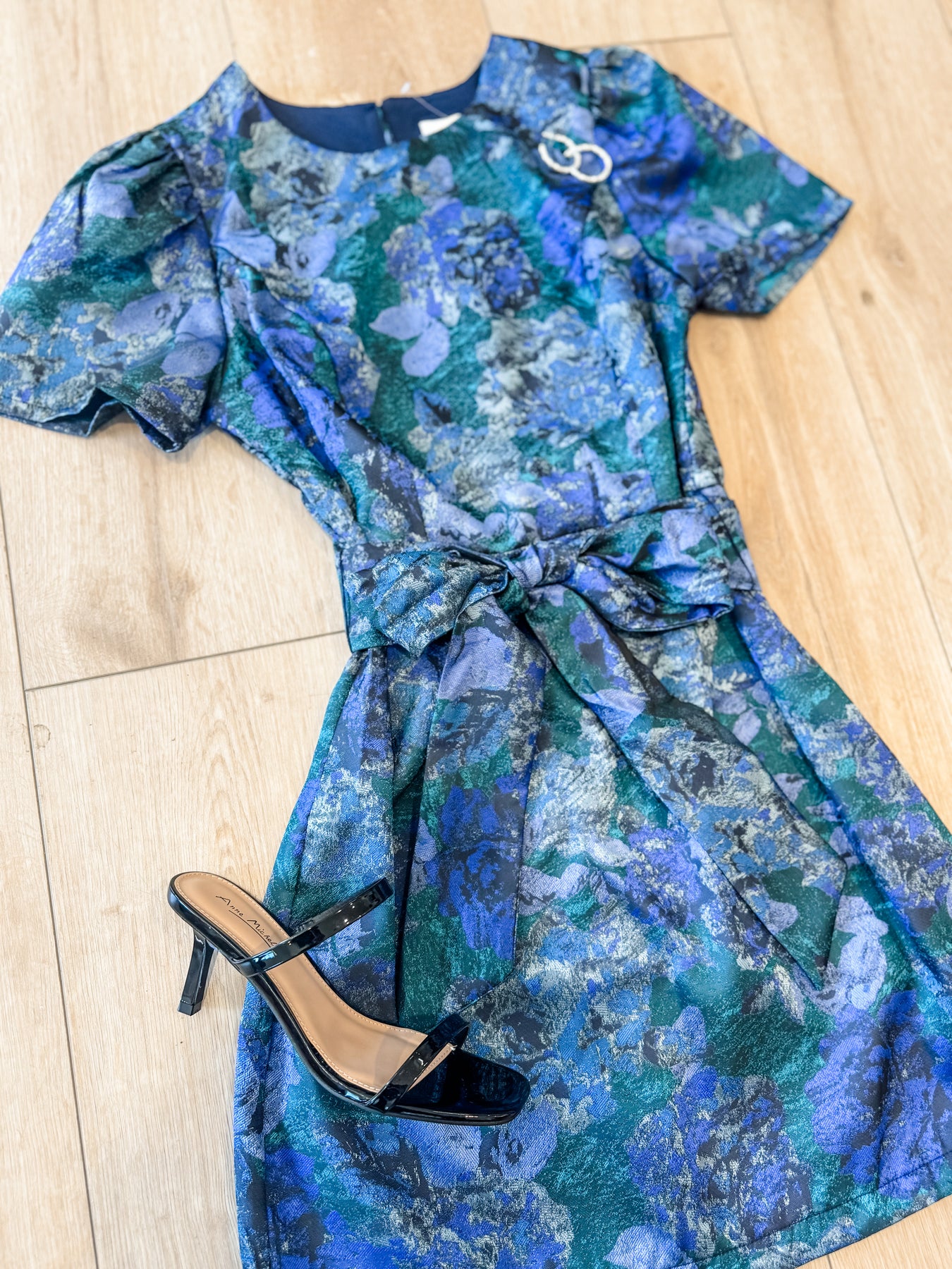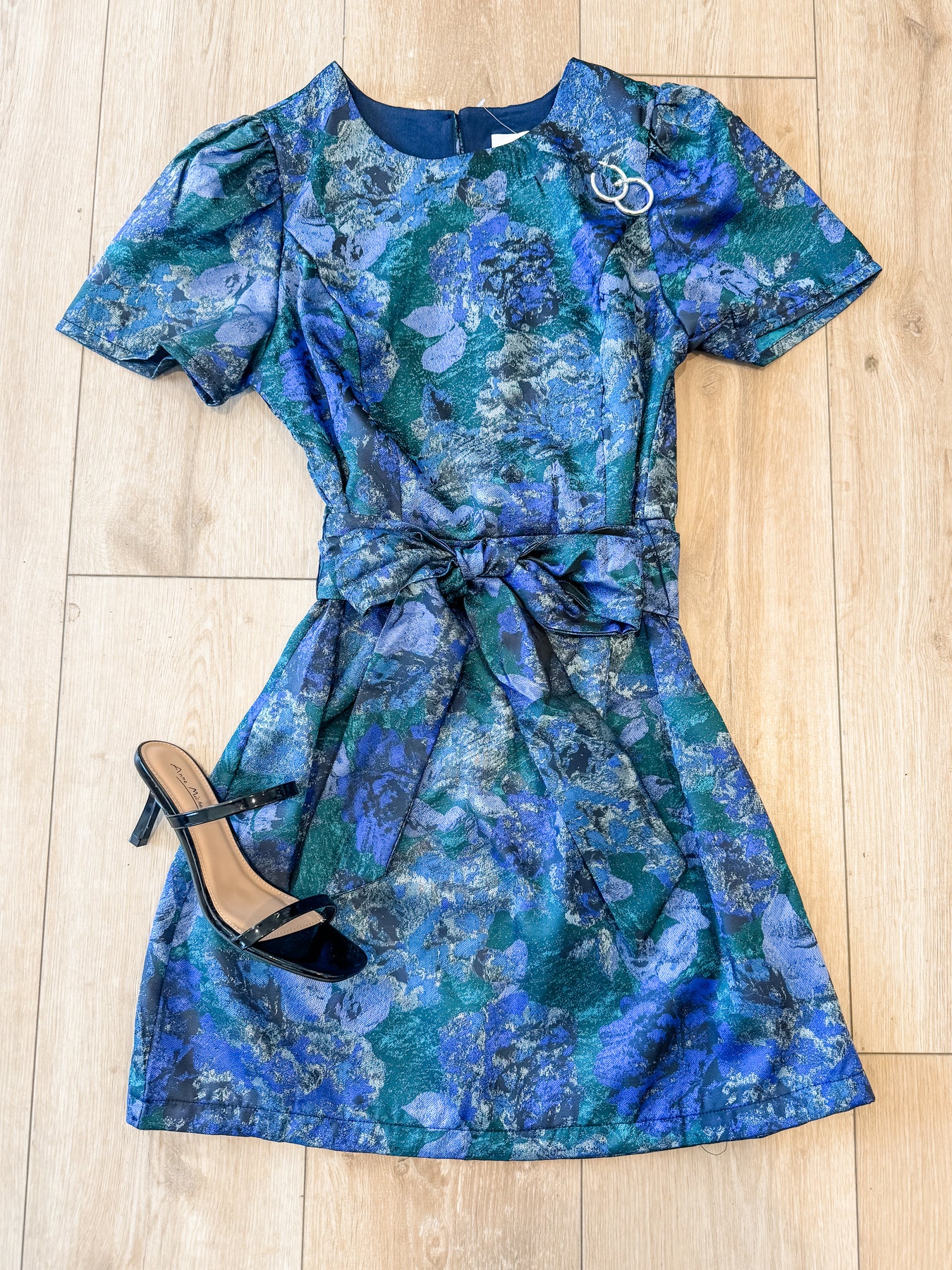 Elegant and timeless, The Vienna Jacquard Dress is made for your most special occasions. Crafted from luxurious jacquard fabric in shades of sapphire, emerald, and indigo, this dress features a flattering tie waist, short puff sleeves, and a sophisticated knee-length silhouette.