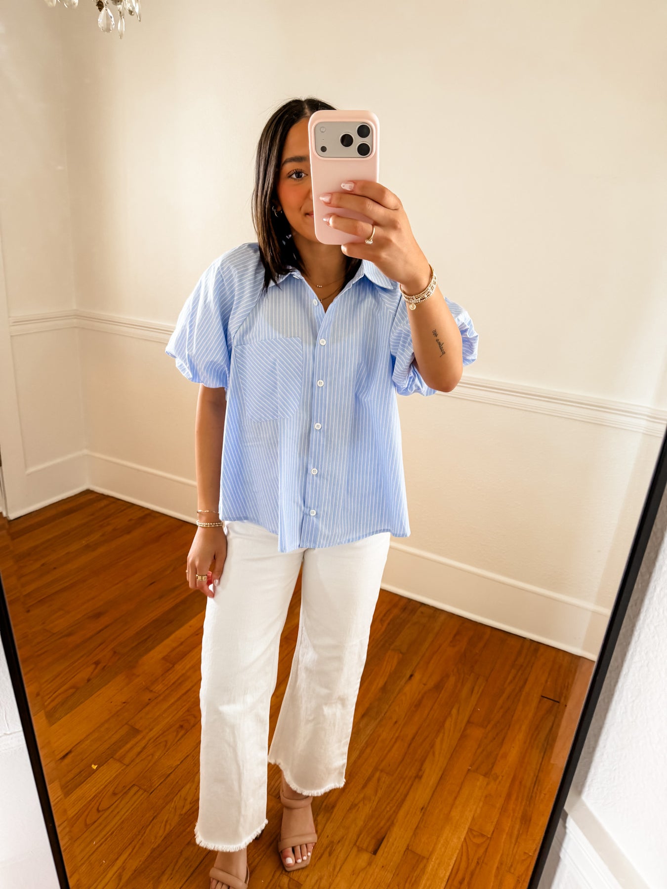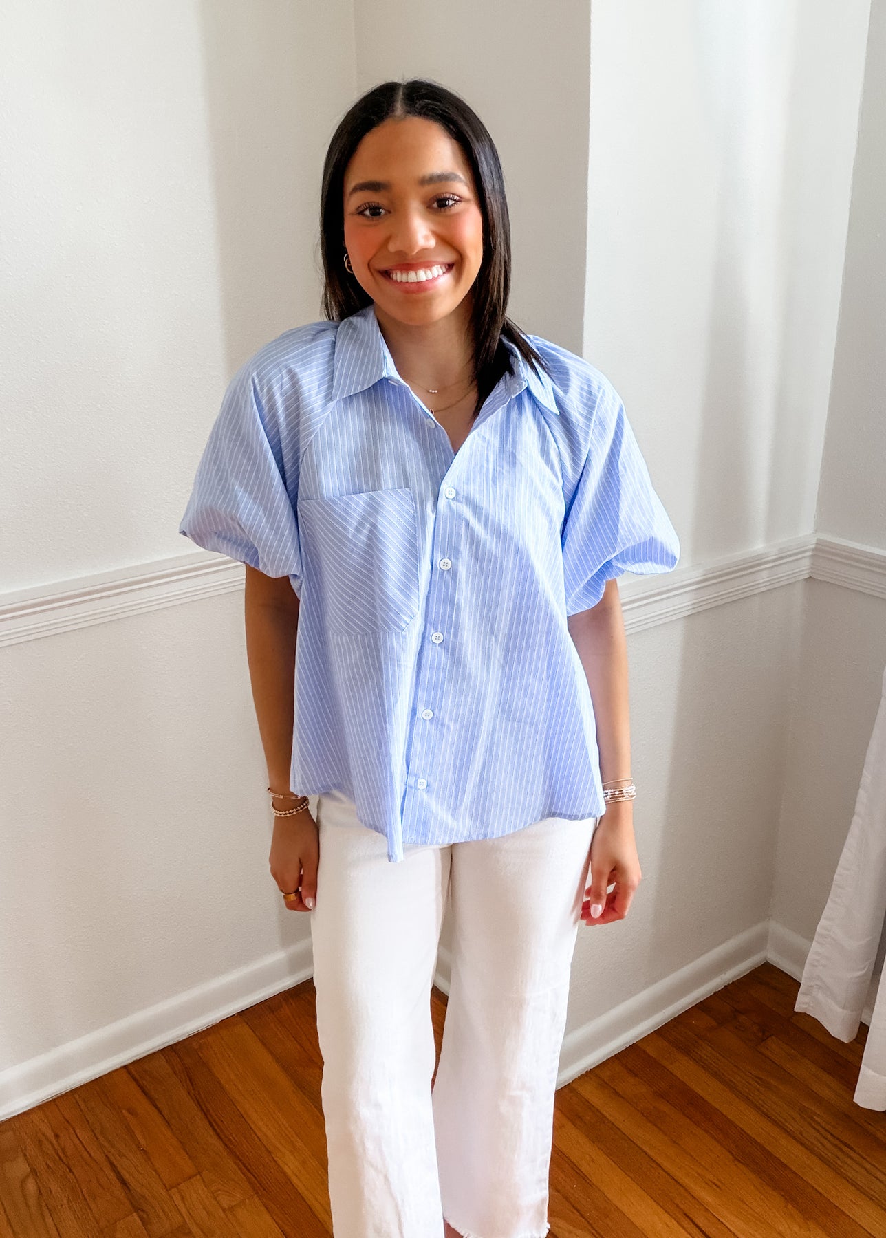 The Harbor Stripe Button-Up Top is a polished everyday essential with thoughtful details that set it apart. Designed in a classic light blue stripe, this top features a relaxed button-front silhouette with softly structured sleeves that are fully lined for a high-quality feel and beautiful drape. Easy, breathable, and timeless, it’s a piece you’ll reach for season after season.