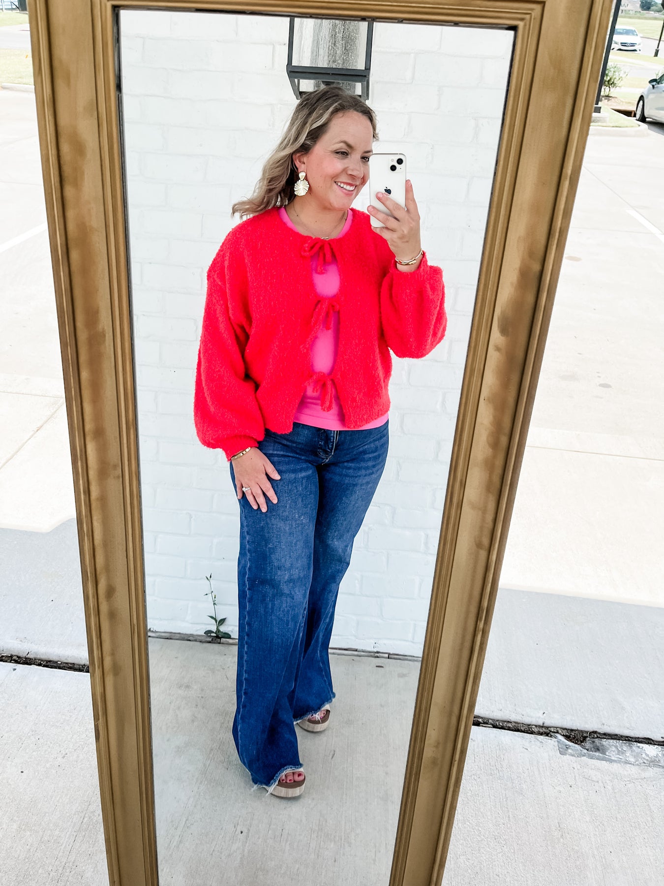 Perfect for date night or a casual day out, this Kiss on the Lips Sweater is all you need! The ribbon tie adds a touch of romance while the fully open design allows for versatility in styling. Pair it with jeans or shorts for a chic look and wear it as a sweater or a cardigan - the choice is yours!