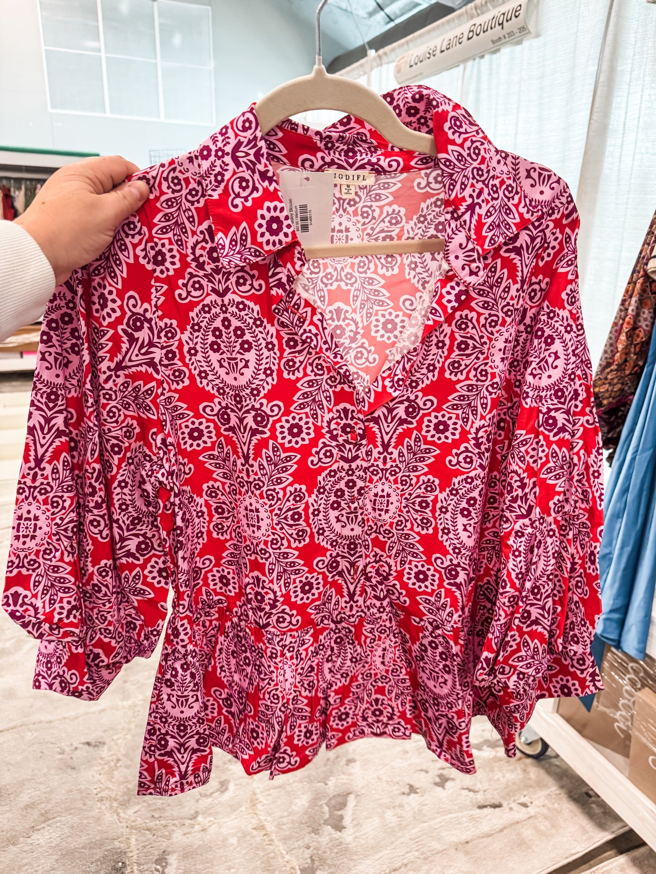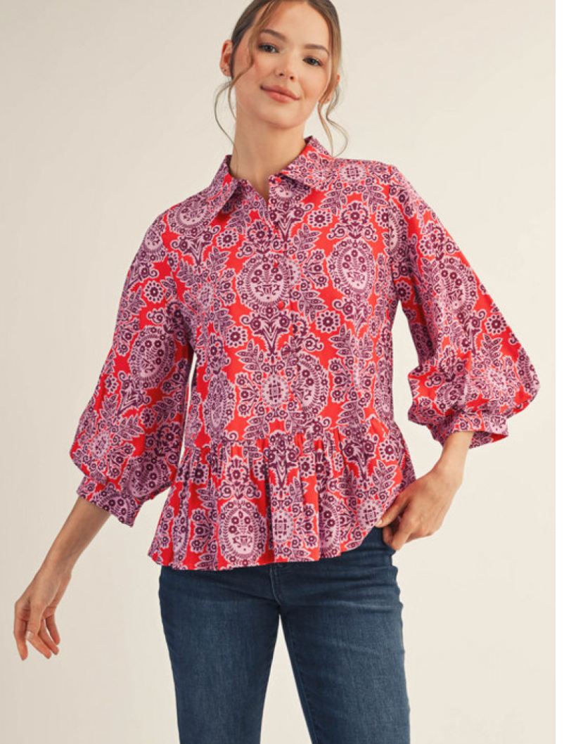 Bold, bright, and perfectly playful — the Poppy Paisley Blouse is everything we love about boutique style! 💕 Featuring a vibrant pink and red paisley print with a flattering peplum hem and voluminous sleeves, she’s the ultimate statement piece for your wardrobe. Pair her with jeans and booties for a fun daytime look or dress her up with black trousers for work or dinner. Lightweight, colorful, and oh-so-flattering — she’s that instant confidence boost you’ll reach for again and again! 🌸✨